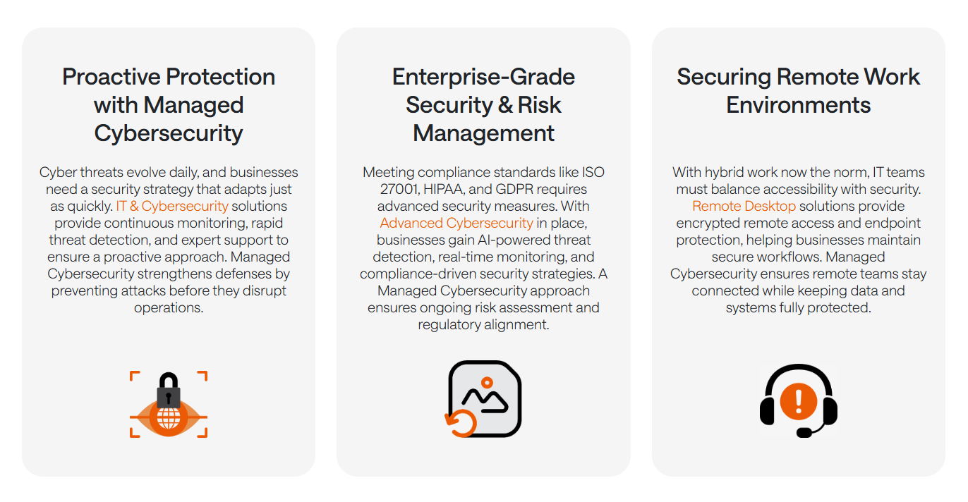 We customize our managed Cybersecurity solutions to fit your unique business needs. Our continuous monitoring, threat detection, and strategic insights empower you to leverage technology safely, establishing us as a trusted cybersecurity company.